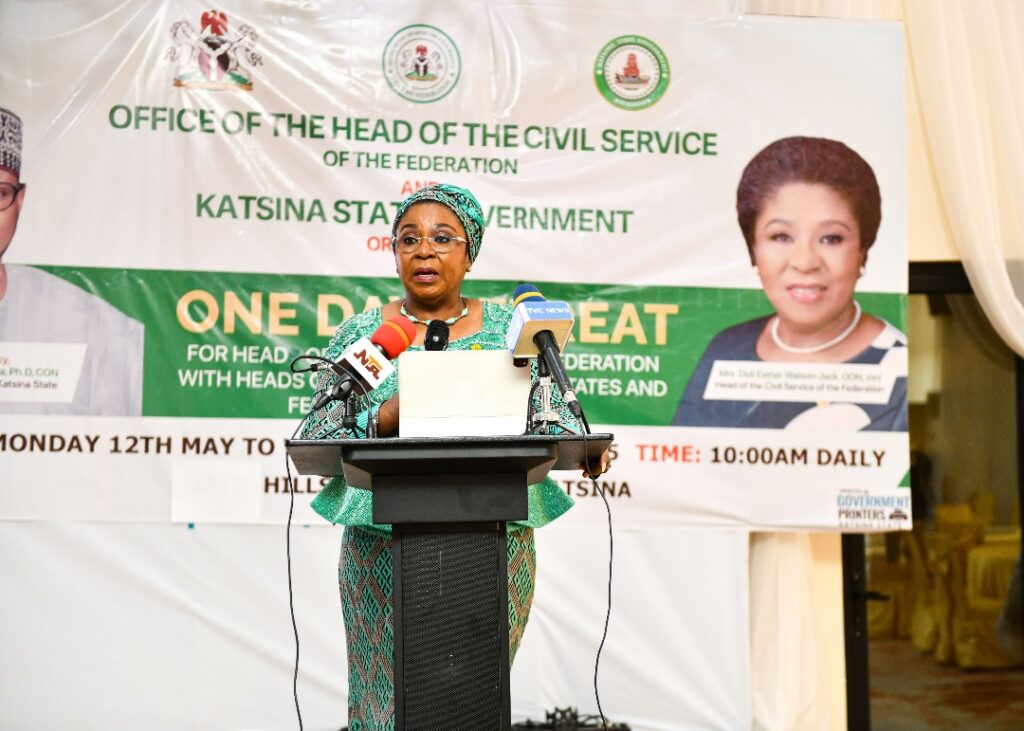 Head of the Civil Service of the Federation, Mrs. Didi Esther Walson-Jack, OOO, mni delivering her opening remarks at the One Day Retreat for Head of the Civil Service of the Federation with Heads of Service from the 36 States and the FCT, held at the Hillside Royal Suites, Kastina on Tuesday, 13th May, 2025.